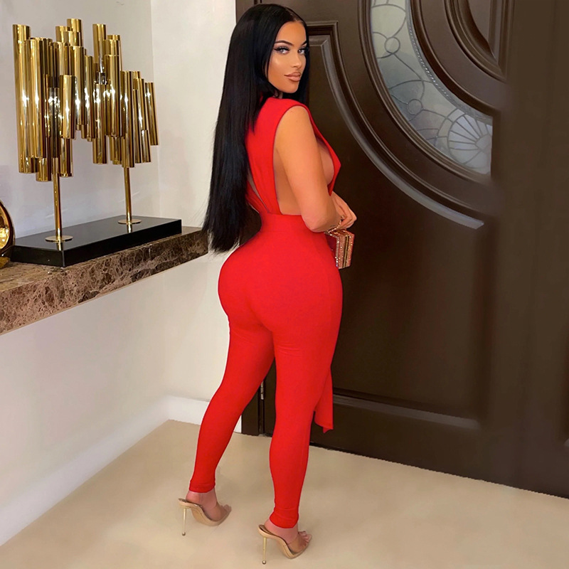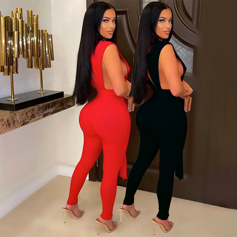 Sexy Skinny V-neck Jumpsuit Women Hollow Out Lace Up Strings Baddies Bodysuit Outfit Overalls Club Outfit Pant Set