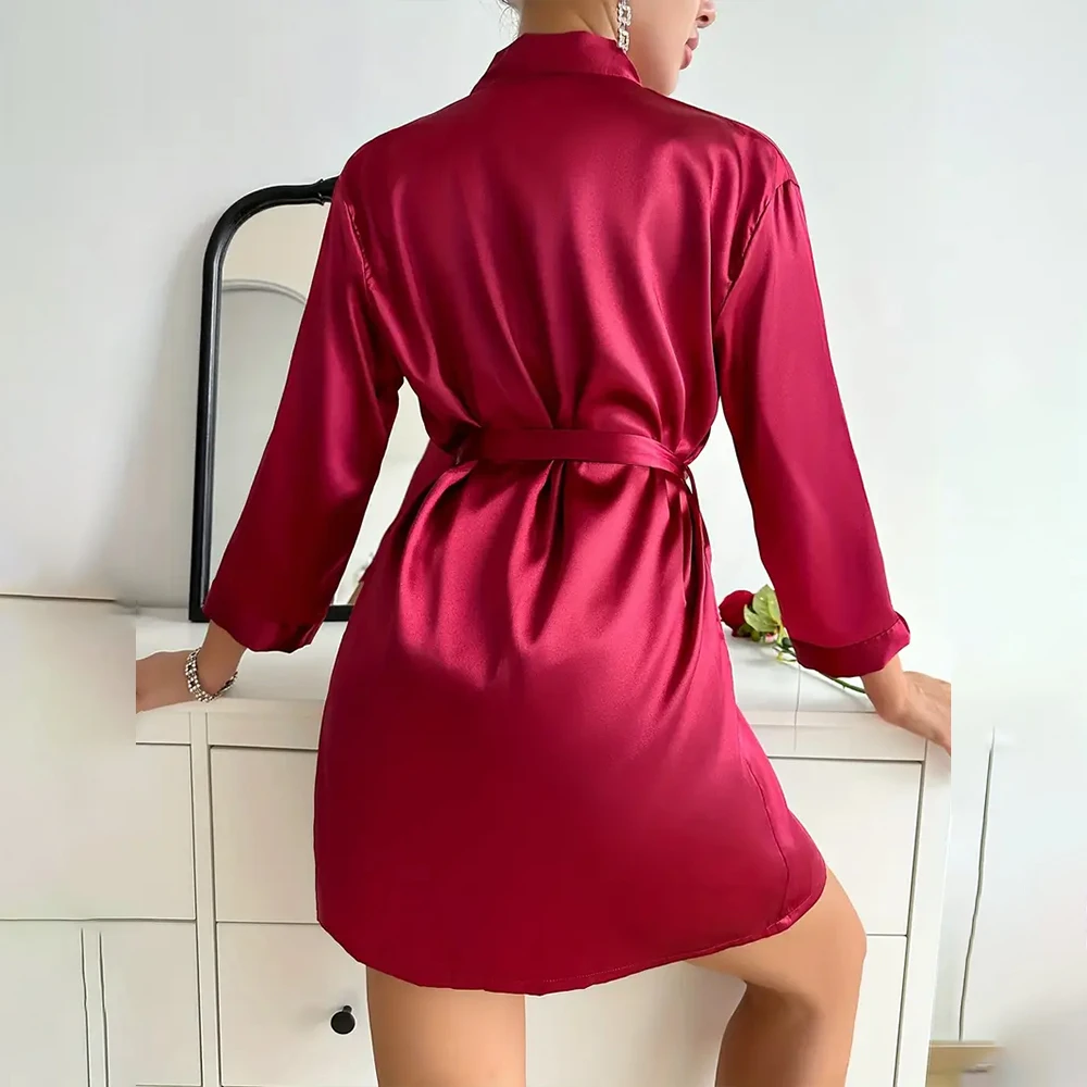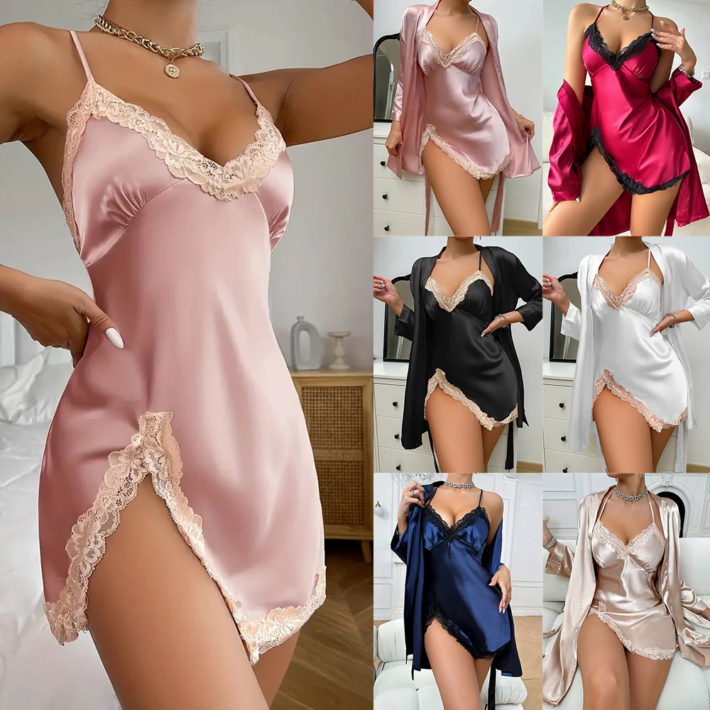 Women's Nightdress Two Piece Sets Night Robe Pajama Set Solid Satin Long Sleeve Robe V Neck Slip Sleep Mini Dress S M L XL 2XL